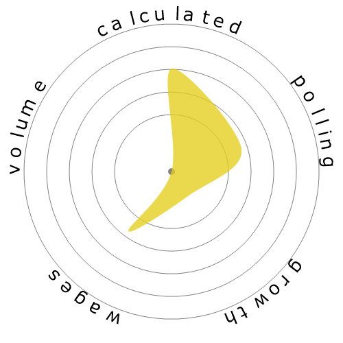 The Snowflake is a visual summary of the five badges: Automation Risk (calculated), Risk (polled), Growth, Wages and Volume. It gives you an instant snapshot of an occupations profile. The colour of the Snowflake relates to its size. The better the occupation scores in relation to others, the larger and greener the Snowflake becomes.